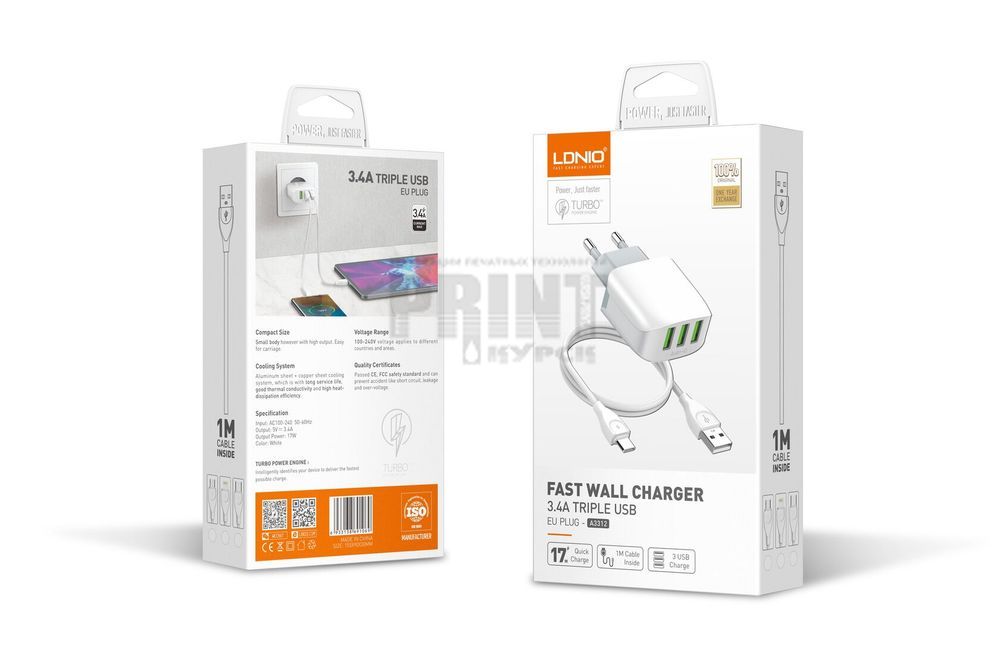 Сетевое зарядное устройство ldnio a3312/ сетевое зу + кабель lightning/ 3 usb auto-id/ выход17w/ white