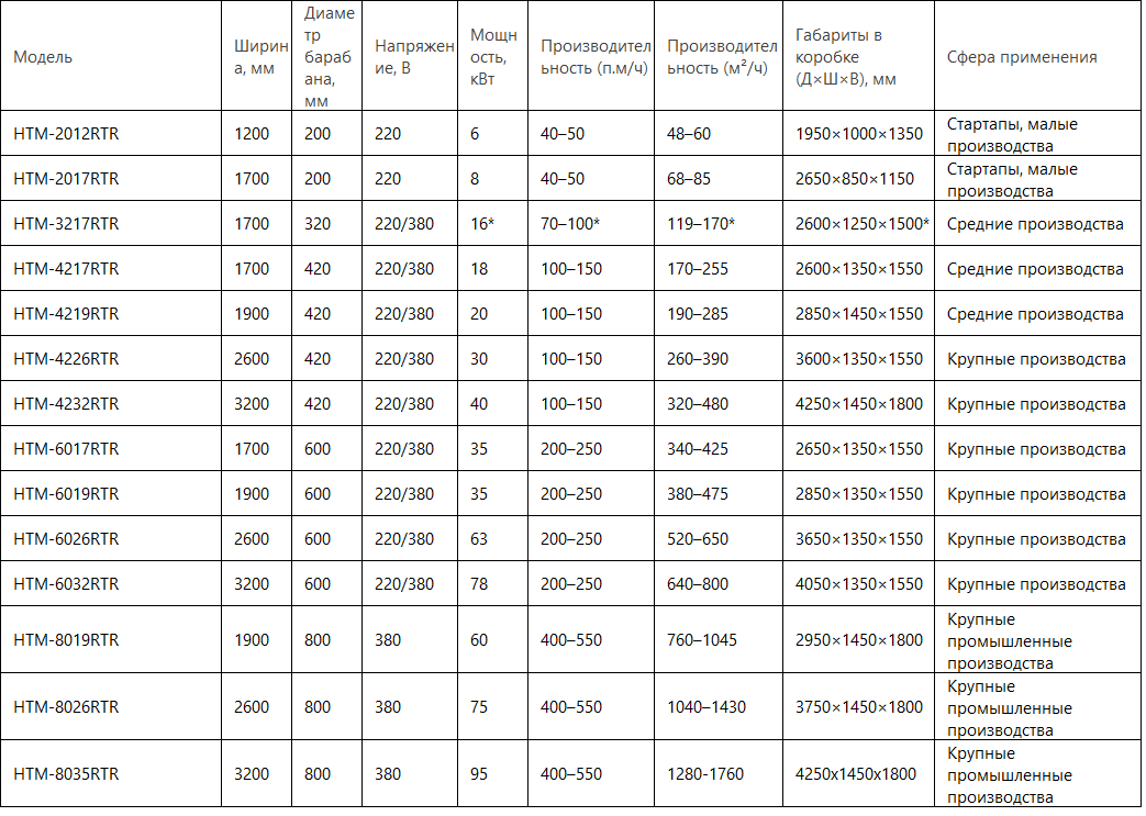 Модели с диаметром барабана 420–600 мм (HTM-4226RTR, HTM-4232RTR, HTM-6017RTR, HTM-6032RTR). Высокая производительность для массового выпуска продукции.